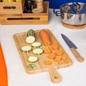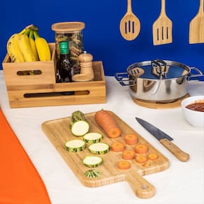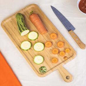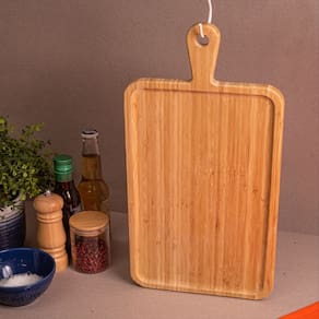 Essa é a tábua de corte de bambu 49,4cm da OIKOS. Versátil bacana para cortar carnes, legumes, pães e muito mais! Design Decorativo ela também ajuda a compor a decoração da mesa e da casa. o tom natural do bambu deixa os ambientes mais rústicos e charmosos. Fácil de guardar possui um furo próprio para pendurar a tábua na churrasqueira ou na parede da cozinha – além de ser Prática, fica linda ;) com pega bacana para facilitar no manuseio e transporte! feita de bambu Material leve e ecologicamente correto. Durável e higiênica o bambu é resistente e tem propriedades que evitam a proliferação de bactérias, só precisa lavar e secar de acordo com as recomendações, combinado?