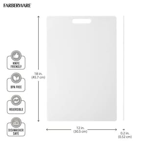 Farberware Tábua de corte de plástico extragrande, pode ser lavada na máquina de lavar louça, para preparação de refeições na cozinha com alça de fácil aderência, 30 cm x 45 cm, branca - Livre de BPA: Esta tábua de corte é feita de plástico de polipropileno livre de BPA. O material de poliéster não é absorvente, não poroso e não abrigará odores, manchas ou bactérias nocivas. É suave com facas, evitando que suas lâminas fiquem cegas rapidamente - Reversível: esta tábua de corte é reversível para dobrar a superfície de corte e possui um orifício de mão para maior controle e estabilidade - Versátil: esta tábua de corte de poliéster é ideal para cortar, fatiar e cortar carnes, aves, peixes e legumes. - Medidas: 30,5 cm de comprimento por 45,7 cm de largura por 0,6 cm de espessura - FÁCIL DE LIMPAR: Esta tábua de corte pode ser lavada na lava-louças para facilitar a limpeza e manutenção sem problemas