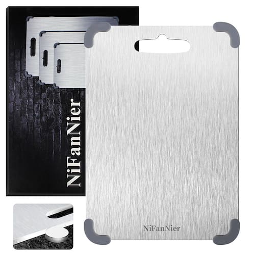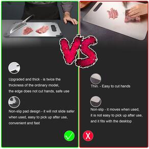 CARACTERÍSTICAS: - Utensílios à prova de ferrugem, resistentes ao desgaste, firmes e duráveis, difíceis de enferrujar, saudáveis e reutilizáveis. - Design arredondado chanfrado, polido artificialmente, redondo e que não machuca as mãos, cuida das mãos e é mais seguro de usar. - Pequenos orifícios redondos podem ser pendurados no gancho. Ambos os lados podem ser utilizados. - Fácil de limpar, basta enxaguar com água. - Alta dureza do titânio, não é fácil deixar arranhões após o uso. -Design Guard Angle, fácil de pegar na tábua de corte ESPECIFICAÇÃO: Nome do produto: placa de corte de titânio Material: titânio Cor: prata Espessura: 0,06 POLEGADAS LISTA DE PACOTES: 1 x Tábua de corte de titânio - Tábua de corte de titânio - Remova os defeitos comuns das tábuas de corte comuns, tábua de corte de titânio com novo design. O helicóptero não pode arranhar a tábua de cortar, sem odor, sem serragem. Design de ângulo de proteção, fácil de pegar na tábua de corte - Nova atualização de 2025 - Nossa tábua de corte é uma atualização experimental, com espessura de 0,06 polegadas e ângulos de proteção adicionais em todos os lados. Não corta as mãos, use com segurança por mais tempo. Ao contrário de outras superfícies de corte duras, nossa tábua de corte de titânio é mais macia do que a maioria das facas de cozinha, garantindo que ela não danifique sua faca ou a torne opaca. - Saúde e Segurança - Nossas tábuas de corte são construídas com os melhores materiais de qualidade alimentar, que são conhecidos por sua robustez, prometem desempenho duradouro e atendem às demandas do uso diário. Nossas tábuas de corte não são apenas duráveis, mas também protegem a saúde e a segurança de suas criações culinárias. Quatro lados com protetor de canto antiderrapante, podem ser mais estáveis e podem ser facilmente retirados após o uso, não serão adsorvidos na mesa. - Design de dupla face - Nossa tábua de corte de titânio apresenta um design de dupla face, perfeita para separar o corte de carnes e frutas/vegetais, evitando efetivamente a contaminação cruzada e fornecendo espaço suficiente para todas as suas necessidades de corte - Fácil de limpar - Sua superfície não porosa repele partículas e líquidos de alimentos, portanto, limpá-la com água corrente é muito fácil. Não é necessário esfregar com força ou encharcar, ele seca instantaneamente, garantindo uma superfície de corte higiênica para sua próxima refeição
