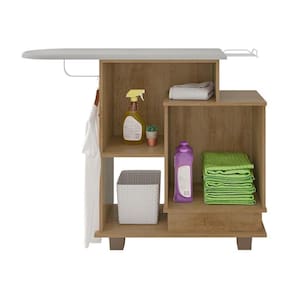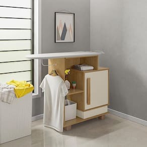 é uma tábua de passar roupas que conta com um pequeno armário em sua parte inferior conta comTecido Antitérmico ePorta Ferro em alumínio.