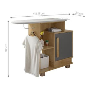 é uma tábua de passar roupas que conta com um pequeno armário em sua parte inferior conta comTecido Antitérmico ePorta Ferro em alumínio.