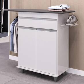 Características do Produto Material da Estrutura: MDP 15mm. Material do Fundo: MDP 3mm. Acabamento: Melamina BP. Peso Suportado: 30 Kg distribuídos. Escala de Brilho: Fosco. Possui Prateleiras: Sim. Material da Prateleira: MDP. Quantidade de Prateleiras: 1 Prateleira. Possui Portas: Sim. Material da Porta: MDP. Quantidade de Portas: 2 Portas. Tipo de Porta: Convencional. Tipo de dobradiças: Metálicas. Possui Gavetas: Sim. Quantidade de Gavetas: 1 Gaveta. Possui Nichos: Não. Possui Puxador:Sim. Possui Pés: Sim, PVC. Diferenciais: - Design moderno. - Pés reguláveis. - Suporte para ferro. - Cabideiro lateral. - Puxadores cromados. - Tábua de passar inclusa. Sistema de Montagem: Cavilhas/Parafusos. Manual de Montagem: Sim. Complexidade da Montagem: Média. Volumes: 1 Volume. Conteúdo da Embalagem: 1 Tábua de passar. Garantia do Fabricante: 90 dias contra defeito de fabricação. Montagem: Recomendamos que seja feita por um profissional. Recomendação de Limpeza: Utilize pano úmido.