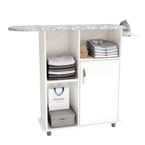 Com um prático suporte para ferro de passar e uma prateleira integrada, você terá tudo ao seu alcance, tornando o ato de passar roupas mais eficiente e organizado.