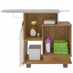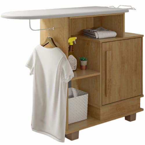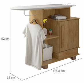 Estrutura: MDPAcabamento: Pintura U.V, acabamento brilhoPorta: Sim, 01 porta de abrir/fechar, com dobradiças metálicasPrateleira: Sim,Tampo da Tabua: Prancha em MDP revestida com tecido antitérmicoCabideiro: Sim, em metalPorta Ferro: Sim, em metalPuxador: Sim, em MDFPés: Sim, 04 pésDiferenciais: Espaços e nichos para vários objetos e produtos para limpezaDimensões do produto montado