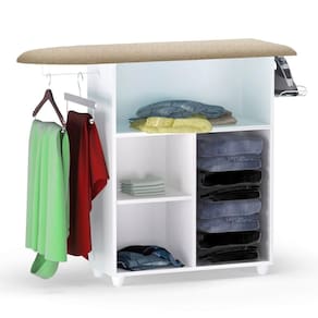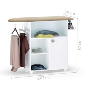 Possui 1 portas, 2 nichos, suporte para o ferro, suporte para cabides e 4 pés.
