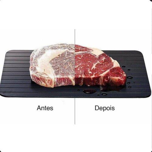 O que vai na embalagem 1 Tábua Descongeladora RápidaAcessórios (se houver): bandeja coletora, espátula, manual rápido Como usar (passo a passo) Posicione a tábua sobre uma superfície plana e estável.Coloque o alimento diretamente sobre a superfície (pode usar um saquinho próprio para alimentos se quiser evitar contato direto).Para resultados ainda melhores, espalhe a porção para aumentar a área de contato com a tábua.Vire o alimento na metade do tempo para descongelar de forma mais uniforme.Descarte os líquidos na bandeja coletora (se houver) e higienize após o uso. O tempo varia conforme espessura, peso e temperatura ambiente. Porções finas tendem a descongelar muito mais rápido do que peças inteiras.Evite usar água quente, forno ou micro-ondas em conjunto: a proposta é descongelar por condução, sem “cozinhar” as bordas.Para peças grandes, corte em porções menores para acelerar o processo. Cuidados e manutenção Lave com água, detergente neutro e esponja macia após cada uso.Evite palhas de aço e abrasivos para preservar o acabamento.Não utilize facas diretamente sobre a superfície (não é uma tábua de corte).Não exponha a fontes de calor direto (fogão, forno, churrasqueira).Se tiver pés de silicone, não force torções; se soltos, recoloque firmemente.Se o seu modelo for compatível com lava-louças, prefira ciclos suaves. Benefícios no dia a dia Mais praticidade: adiante o preparo sem precisar lembrar do descongelamento com horas de antecedênciaMais sabor: ajuda a evitar perda excessiva de sucos que costuma ocorrer em métodos imprópriosMais segurança: sem micro-ondas e sem banhos quentes que podem começar a “cozinhar” fora e deixar o centro ainda duroMais economia: zero consumo de energia elétrica
