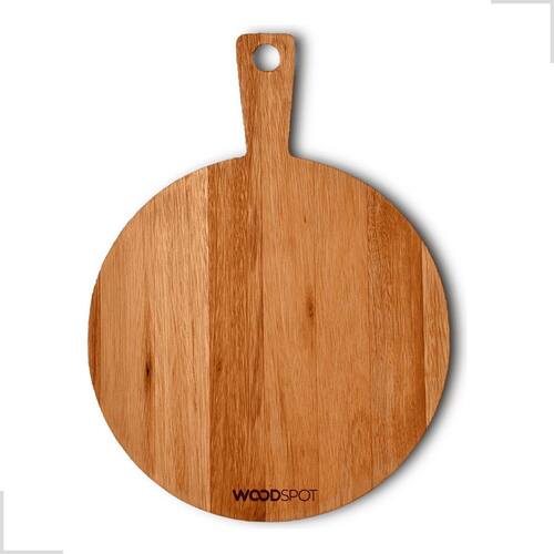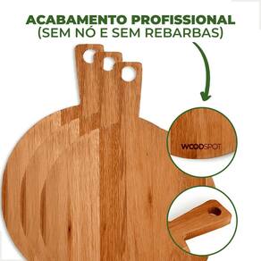 Material: madeira de eucalipto tratado. Espessura: 1,5 cm Tamanho: 40x30cm Diâmetro: 30 cm Tamanho do cabo: 10cm Peso: 900g