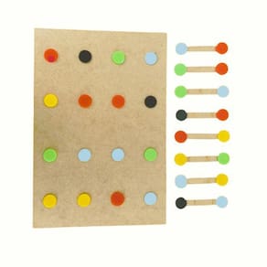 No Tabuleiro com Pontos de Cores, para crianças brincarem com familiares ou educadores, a criança precisa encontrar os pares de pontos e fixá-los aos seus correspondentes no tabuleiro.