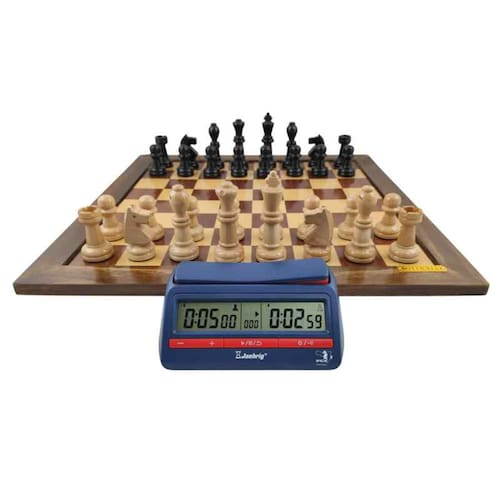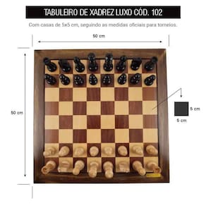 Desvende a essência do xadrez com este Conjunto de Xadrez Oficial feito de madeira nobre. Este kit não é apenas um jogo, mas uma peça de decoração refinada que embelezará qualquer ambiente. O tabuleiro é uma obra-prima da marcenaria.As peças de xadrez meticulosamente esculpidas. Relógio digital com design intuitivo e fácil de operar. Características Especiais:Tabuleiro: Um tabuleiro marchetado com lâminas de imbuia e marfim, casas oficiais de 5x5 cm e acabamento envernizado que ressalta a beleza natural da madeira.Peças Grandiosas e Detalhadas: Com o rei imponente de 10 cm, as peças chumbadas garantem estabilidade, enquanto o feltro protege o tabuleiro de arranhões, promovendo um movimento suave e elegante.Relógio Digital: Este Relógio Digital para Xadrez é uma ferramenta essencial para jogadores sérios de xadrez, oferecendo funcionalidades avançadas em um design elegante e robusto. Perfeito para torneios e práticas, este relógio ajuda a gerenciar o tempo de jogo de forma eficiente, garantindo uma experiência de jogo justa e competitiva. Este conjunto é recomendado para entusiastas e profissionais que apreciam não apenas o jogo, mas a arte do xadrez. Cada partida é elevada a um evento especial com este conjunto, que promete durabilidade, precisão e uma experiência de jogo sem igual. Dimensões e Peso do Tabuleiro e Peças:Tabuleiro: 50 x 50 x 1,5 cmPeças de Xadrez: Altura variável de 5,5 a 10 cm, com diâmetro de base de 28 a 35 mmPeso Total Aproximado: 3 kg