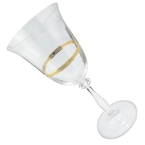 Linha: Ângela Material: Cristal Capacidade: 190ml cada Altura: Aproximadamente 23,5 cm Diâmetro da boca: Aproximadamente 6,5 cm Acabamento: Friso dourado Cor: Transparente com detalhe dourado