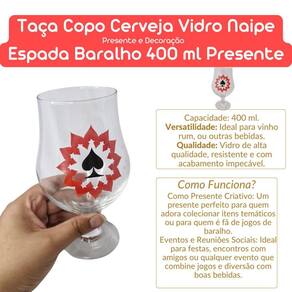 Taça Copo Cerveja Vidro Naipe Espada Baralho 400ml Presente Taça Copo de Cerveja Vidro Naipe Ouros Baralho 400 ml, um presente sofisticado e criativo para quem aprecia uma boa cerveja e adora itens temáticos. Com design exclusivo inspirado no naipe de ouros do baralho, este copo de vidro é perfeito para quem gosta de servir suas bebidas com estilo e personalidade. Com capacidade para 400 ml, ele une funcionalidade e um toque de elegância para qualquer ocasião. Características: