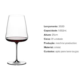 Taça Cristal Importada Winewings 1,002ml Cabernet Sauvignon Winewings possui um design mais que estético, é incrivelmente funcional As taças prometem fazer o vinho voar, ressaltando seus aromas e sabores mais que qualquer outra taça. Dando origem ao nome Winewings: Asas do Vinho Seu corpo feito com o melhor cristal atualmente no mercado torna ainda melhor seu vinho, realçando o sabor e aroma de forma única A linha Winewings além de ser um simbolo da mais alto luxo e elegância também possui uma estrura fina e mais resistente, deixando sua marca por onde passa designe moderno e sofisticadofabricada com o melhor cristal do mundo + Sobre a Taça País de Origem: ÁustriaProdutor: riedelTipo: taças / Copos de CristalDimensões: 25cm de alturaCapacidade: 1.002mlMaterial: cristalCor: transparente - ideal degustar vinhos das variedades Cabernet Sauvignon, Cabernet Franc, Merlot e Petit Verdot, assim como os cortes com a predominância de qualquer uma dessas uvas PRODUTO IMPORTADO