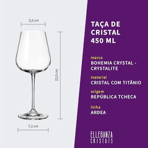 Taça de cristal bohemia para vinho branco 450 ml ardea 2 peças Jogo com 2 taças de cristal para vinho branco 450 ml linha ardea bohemia crystal Resistência titânio e cristal ecológico Detalhes do produto Material: cristal com titânio, mais resistente que o cristal comum Origem: produto da república tcheca Produto: taças de cristal Quantidade: 02 taças Capacidade: 450 ml cada taça Tamanho: 22,5 cm de altura, 5,5 cm de diâmetro de bocal e 7,1 cm de diâmetro de base Marca: bohemia crystal Fábrica: crystalite Linha: ardea Embalagem: os produtos são cuidadosamente envolvidos por plástico bolha e inseridos em uma caixa reforçada para assegurar a integridade do produto no transporte. Substituímos produtos danificados no transporte. Postamos nossos produtos nos correios de 01 a 02 dias úteis após a compra. Todos os nossos produtos acompanham a impressa. Trocas e devoluções Seguimos todas as normas vigentes no código de defesa do consumidor. Adicionalmente, trocamos produtos danificados no transporte. Informações relevantes 1. Já imaginou beber ou servir suas bebidas em taças ou copos de cristal com classe e sofisticação A elleganza cristais comercializa produtos com preços excepcionalmente abaixo do mercado, de qualidade assegurada pela marca tcheca bohemia crystal. Após anos de pesquisa e desenvolvimento, distribui em mais de 100 países cristal de espessura bem fina, livre de Cinza, com design e transparência incríveis. 2. Mas cristal não quebra facilmente Não. O cristal com titânio é muito mais resistente a impactos e mudanças de temperatura se comparado ao cristal comum, proporcionando maior segurança e comodidade no manuseio. A elleganza cristais trabalha apenas com produtos contendo titânio em sua composição, trazendo excelência e qualidade a preços imbatíveis. Sobre a bohemia crystal A bohemia crystal é líder global no mercado de cristais, com atuação em mais de 100 países. Fabrica seus produtos na república tcheca e realiza altos investimentos no desenvolvimento e melhoramento de seus produtos para garantir-lhes qualidade de ponta e ser referência global de qualidade e sofisticação. Eles foram os precursores do movimento que tornou o cristal um material ecológico, sem Cinza em sua composição. Também se destacam de outras marcas ao adicionar titânio para seus produtos mais especiais e assegurar resistência muito superior ao cristal comum. A marca oferece aos seus clientes uma vasta ampla variedade de produtos, desde utensílios domésticos a itens para indústria química. Cada linha de produto tem sua embalagem personalizada de acordo com suas características e tamanho.