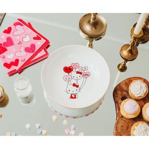 O adorável ícone da Sanrio está aqui para compartilhar um pouco de comida e alguns lindos balões nesta tigela de jantar exclusiva da Hello Kitty. Sua melhor amiga Hello Kitty está aqui para se deliciar com esse design mais leve que o ar, que espera tornar suas refeições favoritas ainda mais saborosas. A cerâmica branca limpa desta tigela estilo cupê é acentuada ao redor da borda rosa com uma linha de corações repetida em estilo cursivo. E essa sensação de capricho é transferida para o interior, onde você a encontrará vestida com seu macacão vermelho, segurando um monte de balões vermelhos e rosa, um dos quais se parece com ela! O design cerâmico sem BPA e sem toxinas desta tigela é seguro para alimentos e está pronto para uso. O design de cupê de borda inferior é perfeito para saborear suas saladas favoritas ou qualquer um dos pratos de macarrão mais saborosos que você possa preparar. E com a esperança da Hello Kitty de que isso ajude seus problemas a desaparecerem. Aprecie o sabor da amizade com este item colecionável oficialmente licenciado da Hello Kitty.