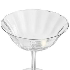 A Taça de Sobremesa Pétala é produzida em vidro. Possui base longa com apoio. A taça é aberta com curvas na borda, como se fossem pétalas de uma flor. É uma peça delicada, que leva um tom romantico à composição da mesa.