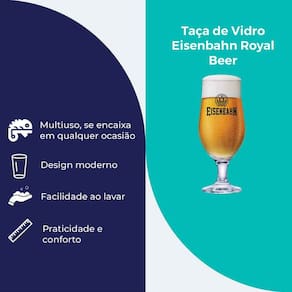 A taça de vidro Eisenbahn Royal Beer da Ruvolo é perfeita para quem busca uma experiência única ao saborear sua cerveja favorita, combinando estilo e elegância em cada gole. Desfrute de momentos especiais com a sofisticação que a Eisenbahn proporciona! Parte de nossa coleção de Grandes Marcas da Ruvolo, essa taça de vidro possui personalização da marca de cerveja Eisenbahn gravada na taça.