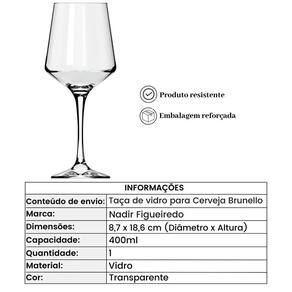 Essa belíssima Taça de vidro para Cerveja 400ml Brunello Transparente vai super bem com qualquer tipo de decoração, graças ao seu aspecto clássico que combina com tudo, vai ornar perfeitamente com os demais utensílios que você tem. Ela será perfeita para usar em festas com seus amigos e família, seu design clean deixará suas comemorações ainda mais elegantes e sofisticadas. Fabricada em vidro de qualidade essa taça apresenta uma excelente resistência. Informações Importantes; Medidas aproximadas - 8,7 x 18,6cm Diâmetro x Altura Capacidade - 400ml Composição - Vidro Cor - Transparente Validade - Indeterminada Fabricante - Nadir Figueiredo Conteúdo do envio - 1 unidade da Taça de vidro para Cerveja 400ml Brunello Transparente. Produto 100% nacional Mais Informações; Evite pancadas ou impactos pois podem trincar, lascar ou danificar o produto. Pode ser lavado em lava louças. Ao lavar use de preferência detergente neutro, esponja macia e enxague com água em abundância. Taça de vidro para Cerveja 400ml Brunello Transparente