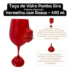 Taça de Vidro Pomba Gira Vermelha com Rosas - 490 ml A Taça de Vidro Pomba Gira Vermelha com Rosas é uma peça especial, com capacidade para 490 ml, criada para ser utilizada em altares de Umbanda e Candomblé. Com seu design vibrante e simbólico, a taça homenageia Pomba Gira, entidade de grande poder e transformação. A cor vermelha, associada à força e ao amor, juntamente com as rosas, símbolos de beleza e paixão, traz uma energia intensa e acolhedora para as práticas espirituais. Feita de vidro de alta qualidade, esta taça é resistente e perfeita para complementar seu altar ou espaço sagrado. Características: