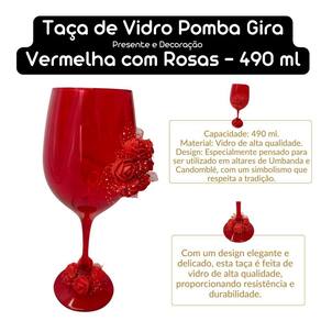 Taça Vidro Pomba Gira Vermelho com Rosas + Presente Adquira esta Taça maravilhosa e ganhe um lindo presente. Taça de Vidro Pomba Gira Vermelha com Rosas - 490 ml A Taça de Vidro Pomba Gira Vermelha com Rosas é uma peça especial, com capacidade para 490 ml, criada para ser utilizada em altares de Umbanda e Candomblé. Com seu design vibrante e simbólico, a taça homenageia Pomba Gira, entidade de grande poder e transformação. A cor vermelha, associada à força e ao amor, juntamente com as rosas, símbolos de beleza e paixão, traz uma energia intensa e acolhedora para as práticas espirituais. Feita de vidro de alta qualidade, esta taça é resistente e perfeita para complementar seu altar ou espaço sagrado. Características: