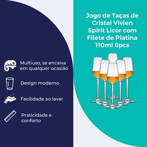 Sofisticada e moderna, a Taça de Licor Vivien Spirit para licor é ideal para quem valoriza estilo e qualidade ao degustar bebidas especiais. Produzida em cristal de sublime qualidade, combina transparência impecável com um design delicado, proporcionando uma maravilhosa experiência visual e sensorial.
