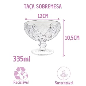 Taça de Sobremesa de 335ml Diamante Com sua capacidade de 335ml, essas taças são ideais para servir porções generosas de sobremesas como sorvetes, mousses, pudins e outras delícias. Além disso, por serem transparentes, permitem que você aprecie a beleza das camadas e texturas de suas sobremesas, tornando a experiência de saboreá-las ainda mais agradável. Estas taças são fáceis de limpar e podem ser utilizadas em diversas ocasiões, proporcionando um toque especial e elegante à sua mesa.