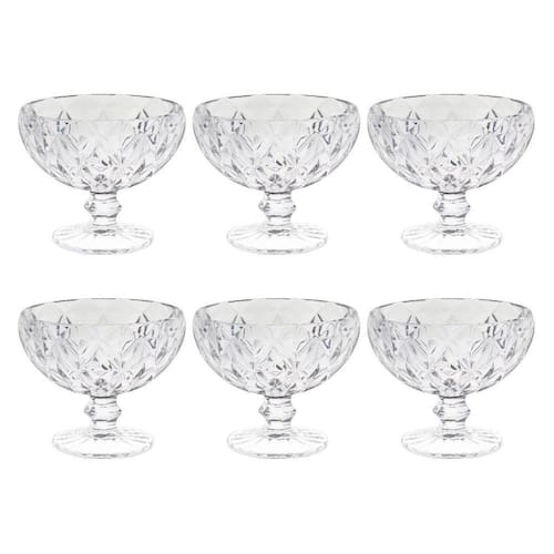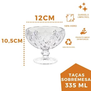 Taça de Sobremesa de 335ml Diamante Com sua capacidade de 335ml, essas taças são ideais para servir porções generosas de sobremesas como sorvetes, mousses, pudins e outras delícias. Além disso, por serem transparentes, permitem que você aprecie a beleza das camadas e texturas de suas sobremesas, tornando a experiência de saboreá-las ainda mais agradável. Estas taças são fáceis de limpar e podem ser utilizadas em diversas ocasiões, proporcionando um toque especial e elegante à sua mesa.