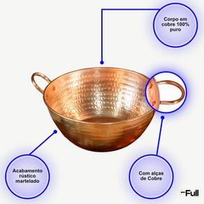 O cobre 100% puro é conhecido por sua excelente condução térmica, garantindo um cozimento uniforme e eficiente. Ideal para o preparo de doces artesanais, compotas, molhos e receitas de longa cocção, este tacho proporciona sabor e textura incomparáveis aos seus pratos.