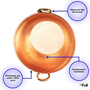 O cobre, conhecido por sua excepcional condução de calor, garante um cozimento uniforme, permitindo que seus pratos alcancem um sabor e textura incomparáveis. As alças de bronze, além de serem robustas e duráveis, conferem um charme rústico e atemporal, tornando o manuseio do tacho seguro e confortável.