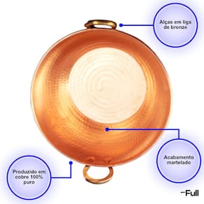 O cobre, conhecido por sua excepcional condução de calor, garante um cozimento uniforme, permitindo que seus pratos alcancem um sabor e textura incomparáveis. As alças de bronze, além de serem robustas e duráveis, conferem um charme rústico e atemporal, tornando o manuseio do tacho seguro e confortável.
