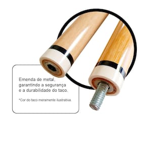 O acabamento do Taco Desmontável Bola 8 é feito com tintas e verniz PU, que garantem um aspecto brilhante e durável, sem amarelar com o passar do tempo. A emenda é de metal, garantindo a segurança e a durabilidade do taco.