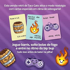 Entre no clima dos jogos retrô com o Taco Gato 8-bit da PaperGames, uma versão nostálgica e superdivertida do clássico jogo que conquistou adultos e crianças Inspirado nos videogames dos anos 90, esse jogo de festa rápido e caótico é perfeito para jogar com amigos ou em família.