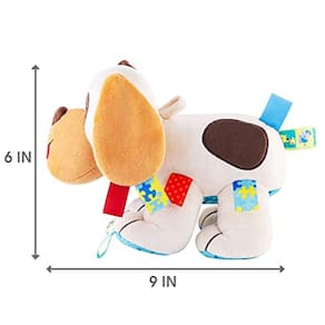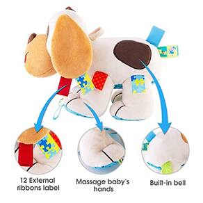 Taggies tamanho do cão: 9 "* 6", divertido para as mãos pequenas para agarrar, o corpo é o tamanho ideal para abraços e abraços. Este brinquedo macio tem 12 etiquetas de cor em seu corpo, sinos embutidos que fazem sons agradáveis, grânulos de massagem em seus pés, nosso propósito é esperar que o bebê se divirta com este adorável cão, para construir a interação da criança: Desenvolvimento Visual, Desenvolvimento Auditivo, Coordenação da Mão. Feito com tecido de microfibra ultra-macio e com detalhes bordados. Os taggies são adornados com etiquetas de laço de cetim interativas e calmantes que os bebês adoram explorar e esfregar. Lavável à máquina em água fria em ciclo suave, seco ao ar. Tudo feito com rigorosos padrões de qualidade para atender ou exceder-nos os requisitos de segurança do brinquedo. Ótimo presente para o bebê.