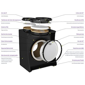 O Tajon Master une a praticidade do cajon com a possibilidade sonora semelhante a uma bateria. Bumbo com pele de 14", caixa com 10", Ton de 10" e ton de 8".