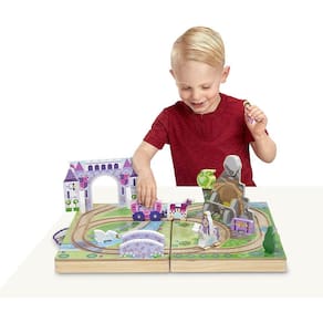 Estradas construídas, uma carruagem de rodas, uma montanha, caverna e castelo, criaturas míticas e peças divertidas permitem que as crianças levem suas imaginações em aventuras reais. . . e tomar tempo de jogo onde eles querem ir! Desdobre a caixa de madeira resistente para criar uma superfície de jogo ilustrada com faixas embutidas em todo o reino. A carruagem real de madeira para o príncipe e a princesa pode ser puxada por um cavalo ou unicórnio! Montar um castelo para atravessar e uma montanha com uma caverna de dragão; deslize o pedregulho (ou outra peça de jogo) descendo a montanha para matar o dragão e resgatar seu prisioneiro ou encontrar o baú do tesouro escondido! Há inúmeras possibilidades imaginativas de contar histórias. Todas as peças armazenam na caixa dobrável com alça de transporte conveniente (há muito espaço para adicionar outros brinquedos, também!) para fácil limpeza e viagem. Mantenha o tempo de jogo rolando para crianças de três anos ou mais e incentive o desenvolvimento de habilidades independentes e de habilidades motoras.