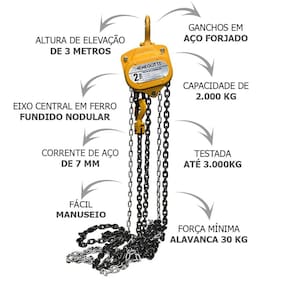 Projetada para proporcionar durabilidade e performance, a talha conta com corrente de alta resistência com diâmetro de 7 mm e uma força de alavanca de apenas 30 kg, tornando o manuseio mais leve e seguro. Além disso, ela é submetida a testes rigorosos que garantem um desempenho superior, suportando até 3000 kg em testes de carga.