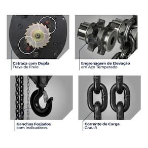 Benefícios e Vantagens: 1. Elevada capacidade de carga de até 5 toneladas. 2. Altura de elevação de 10 metros, ideal para diversas aplicações. 3. Alto fator de segurança (4:1) para confiança do operador. 4. Dupla roldana, guia da corrente em aço temperado, e dupla trava de segurança. 5. Corrente de carga grau 80, calibrada e temperada. 6. Gancho em aço forjado com rotação de 360° e indicadores de deformação. 7. Corrente de elevação galvanizada e calibrada (baixa manutenção). 8. Alta qualidade, tecnologia, tratamento térmico, anticorrosivo e antioxidante. 9. Conformidade com normas internacionais de segurança (EN 818-2). 10. Testada individualmente para garantir máxima confiabilidade.