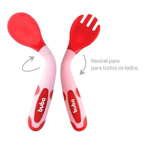 O Kit Talher Flexível e Termossensível da Buba foi desenvolvido especialmente para ajudar o bebê no processo de aprendizado da alimentação. O garfo e a colher são moldáveis, podendo ser direcionados para a direita ou esquerda, proporcionando mais conforto e praticidade para destros e canhotos.