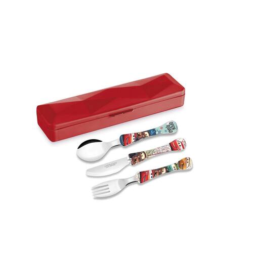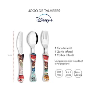 Jogo de talheres infantil, sendo garfo, faca e colher. Ideal para levar na mochila, bolsa ou viagem. Os talheres da linha Kids Simonaggio são produtos que estimulam a fase da descoberta dos alimentos. E acompanham de forma segura cada etapa de exploraçao e aprendizado da criança, ate a fase da pre-adolescencia onde estao atentos a referencias de desenhos animados. Os talheres possui cabo de polipropileno e lamina de aço inoxidavel, pode ser lavado na lava louças e livre de Bisfenol A (BPA Free).