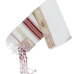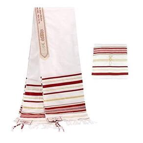 talit messiânico - importado de israel medidas: 55 cm x 1,80 cm tecido: acrilã - 100% poliéster. Cor: vermelho e dourado - com atara e tzitzi do talit em vermelho com dourado. Segue com bolsa de transporte