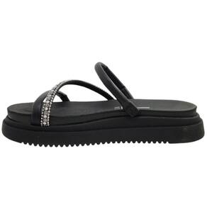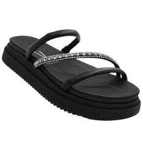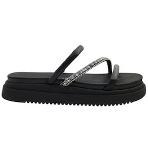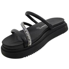 Confeccionado em material sintético este modelo garante maior durabilidade e resistência. Com seu design cuidadosamente elaborado, ideal para quem busca equilíbrio entre moda e praticidade. As tiras, abraçam o pé delicadamente, oferecendo um ajuste confortável, mas também adicionando uma dose extra de estilo ao visual. O destaque fica para as aplicações de strass ao longo da tira principal, conferindo um toque de brilho e muita personalidade.