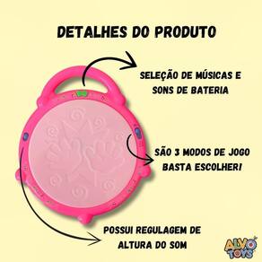 Tambor de Brinquedo Musical com Luzes e Sons , acompanha 2 baquetes, possui 3 Modos de Jogo, 9 Músicas e 9 Sons de Bateria