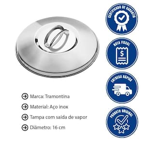 - Você vai encontrar sofisticação e utilidade com a Tampa Avulsa Tramontina Solar em Aço Inox 16 cm de Diâmetro.