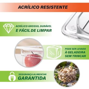 Fabricada em acrílico resistente (policarbonato), ela protege os alimentos contra contaminações, permite visualização rápida do conteúdo e ainda conta com recorte exclusivo, que possibilita deixar a colher de acrílico encaixada mesmo com a tampa colocada – perfeita para o serviço contínuo e ágil.