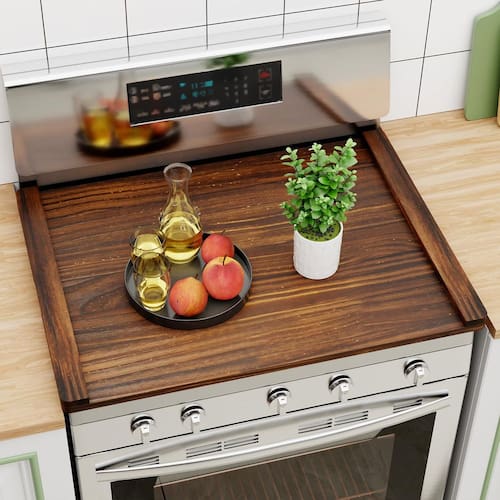 Bandeja de madeira maciça superior: Feita de madeira maciça, as coberturas de fogão para fogão a gás oferecem resistência e durabilidade. As qualidades inerentes à madeira maciça tornam esta cobertura de fogão a gás uma escolha ideal para aqueles que buscam funcionalidade e longevidade. A estrutura natural de madeira maciça garante que as coberturas de fogão a gás mantenham seu apelo estético e integridade estrutural por muitos anos, proporcionando uma adição confiável e atraente à configuração da sua cozinha. Ajuste ideal para qualquer fogão: a bandeja de madeira da tampa superior do fogão mede 73 cm x 53 cm e é meticulosamente projetada para compatibilidade universal, tornando a tampa do fogão a lenha adequada para fogões de vidro, elétricos e a gás, como tampa superior de fogão de vidro, tampa superior do fogão de bobina elétrica, tampa superior do forno, tampa superior do fogão plana e tampa de fogão de cerâmica. O tamanho preciso das tábuas de macarrão garante um ajuste confortável e seguro em qualquer fogão, fornecendo uma superfície estável para preparação de refeições, servindo ou até mesmo como um espaço extra na bancada. Espaço transformador da cozinha: Quando colocado no seu fogão, a placa de cobertura do fogão transforma instantaneamente sua cozinha, fornecendo espaço adicional no balcão. Se você está preparando uma refeição grande, recebendo convidados ou simplesmente precisa de espaço extra para seus utensílios de cozinha e tábua de cortar, esta tampa de fogão de madeira serve como uma ferramenta utilitária. O design multifuncional do protetor de fogão permite que você maximize a eficiência da sua cozinha e mantenha seu espaço de trabalho organizado e livre de bagunça. Esta versatilidade garante que a placa de cobertura superior do fogão de madeira possa ser usada em uma variedade de configurações de cozinha, oferecendo conveniência e praticidade para todas as suas necessidades culinárias e organizacionais. Design pronto para usar: com seu design fácil de usar e pronto para usar, a bandeja rústica de fazenda embutida para maior segurança e eliminando o tedioso processo de montagem, tornando a tampa do fogão de bloco de açougueiro uma adição sem complicações à sua cozinha. Direto da caixa, oferece - Durabilidade superior: Feita de madeira maciça, mede 74 cm x 55 cm, esta capa de fogão oferece resistência e confiabilidade duradouras, mantendo o apelo estético ao longo do tempo. - Ajuste e proteção perfeitos: cabe fogões de vidro, elétricos e a gás confortavelmente com almofadas de borracha para proteger os fogões de arranhões e amassados, proporcionando espaço estável e extra no balcão. - Utilitário versátil: Adiciona espaço extra no balcão e funciona como uma bandeja decorativa ou tábua de corte, melhorando a eficiência e a organização da cozinha. - Pronto para usar e fácil manutenção: sem necessidade de montagem, com alças embutidas para uso imediato. Fácil de limpar com um simples pano, perfeito para famílias ocupadas. - Design elegante: O design rústico de madeira adiciona calor e complementa qualquer decoração de cozinha, do moderno à casa de fazenda, melhorando o estilo e a funcionalidade.