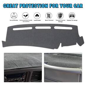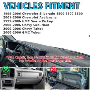 Capa de painel para Chevrolet Chevy Silverado GMC Sierra 1999-2006, tapete para caminhonete Chevy Avalanche Tahoe Suburban GMC Yukon 2000-2006 - Design personalizado de ajuste perfeito: o tapete de cobertura de painel para Chevrolet Silverado 1999-2006 1500 2500 3500 GMC Sierra Pickup, (não clássico, tem 3 aberturas perto da proteção da janela, tem alça no lado do passageiro), para Chevrolet Avalanche 2001-2006, para Chevy Tahoe 2000-2006, para 2000-2006 0000-2006 Chevy Suburban, para GMC Yukon 2000-2006 - Proteção do painel: protege a superfície do painel dos raios ultravioleta que podem causar rachaduras e deformações, também pode bloquear a sujeira, evitar que arranhões danifiquem o painel, melhorando o estilo geral do seu carro. A capa do painel também ajuda a reduzir o brilho perigoso do para-brisa, mantém os interiores mais frescos no verão e mais quentes no inverno - Segurança: o reflexo da luz do sol e da luz do veículo oposto é fácil de causar acidentes de trânsito. Nosso tapete de painel reduzirá esse reflexo, melhorará sua confiança ao dirigir. Também evita que as coisas deslizem no painel do seu carro - Design personalizado perfeito: capa de painel de carpete medida a laser ajuste personalizado ao seu caminhão. Sabemos o quão importante é a ventilação de ar condicionado para seu caminhão, suas aberturas de ar condicionado e sensores não serão cobertos - Fácil instalação: o tapete da capa do painel é feito de material ambiental, sem cheiro químico ou odor de material, excelente artesanato, parece muito elegante e moderno, 5 minutos para instalar, mantido no lugar usando abas de fecho aderente eliminando o deslizamento