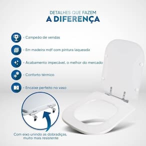 Itens inclusos: assento e tampa em madeira MDF com pintura laqueada. Ferragens metálicas em alumínio anodizado muito resistente, não oxidam e não enferrujam.