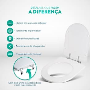 Limpeza: recomenda-se a limpeza do assento sanitário poliéster com água e sabão neutro, não utilizar produtos abrasivos.