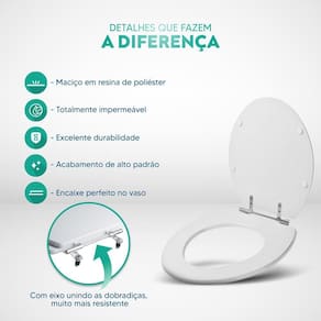 Limpeza: recomenda-se a limpeza do assento sanitário poliéster com água e sabão neutro, não utilizar produtos abrasivos.