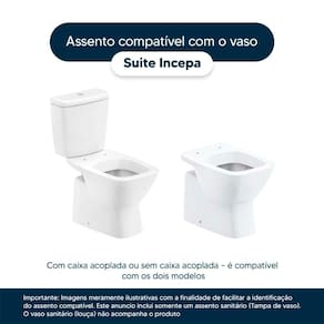 Instalação Simples e Rápida: Com todos os parafusos e componentes necessários inclusos, a instalação é rápida e descomplicada. Seu novo assento estará pronto para uso em questão de minutos. Desenvolvido especificamente para o modelo Suite da marca Incepa, com ou sem caixa acoplada, proporciona um encaixe perfeito, oferecendo estabilidade e conforto durante o uso.