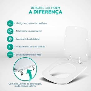 Durabilidade e Resistência: Fabricado em resina maciça de poliéster, este assento sanitário é altamente resistente e totalmente impermeável.